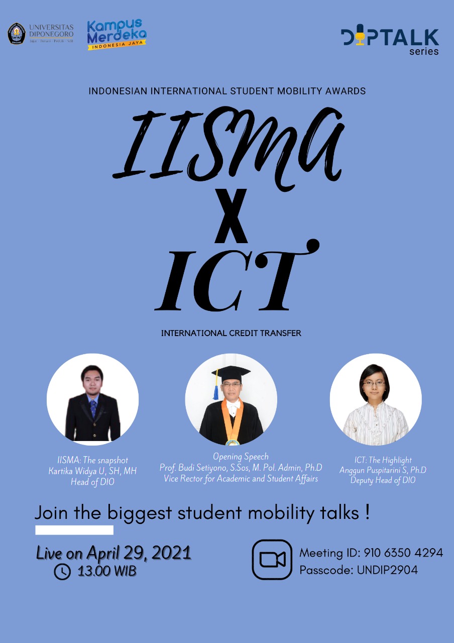 Bagi mahasiswa Universitas Diponegoro dapat memperoleh informasi lebih lanjut dengan mengikuti DIPTALK mengenai IISMA dan ICT (International Credit Transfer) pada tanggal 29 April 2021.