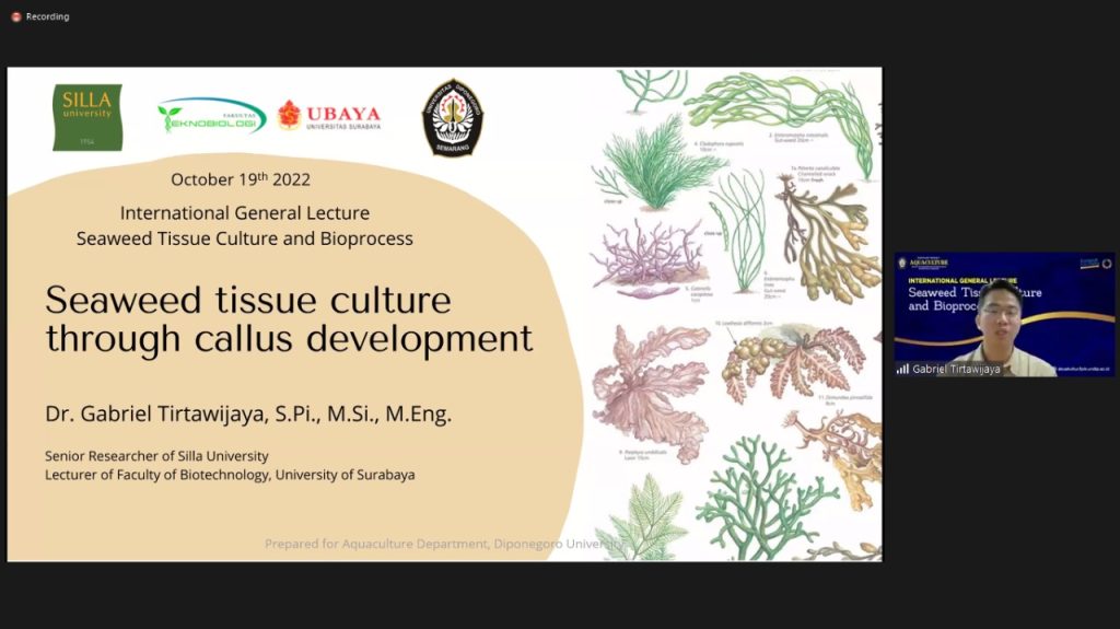 Aquaculture, Semarang – Seaweed is one of the commodities with promising prospects, but the availability of high-quality seeds and their utilization still need to be a concern. Starting from this, the Department of Aquaculture, Faculty of Fisheries and Marine Sciences, Diponegoro University, held an International General Lecture titled “Seaweed Tissue Culture and Bioprocess.”